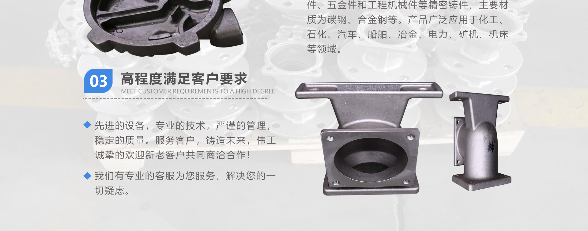 安徽偉工機械科技有限公司,坐落于安徽蕪湖新蕪經(jīng)濟開發(fā)區(qū),是一家専業(yè)從事鑄造產(chǎn)品設(shè)計、研發(fā)、生產(chǎn)、銷售于一體的企業(yè),公司為客戶的產(chǎn)品提供多樣的技術(shù)支持與設(shè)計,公司主要鑄造技術(shù)有潮模砂鑄造、硅溶膠精鑄工藝。主要產(chǎn)品有:不銹鋼閥門配件、泵閥配件、汽車配件、工業(yè)管道配件、工程機械配件、汽車配件等。材質(zhì)為:低合金鋼、304、316、316L、鉻鉬鋼、哈氏合金、碳鋼、雙相鋼等。公司已先后通過ISO9001和TS16949等多種體系審核,以完備的管理手段和齊全的檢測設(shè)備滿足客戶需求,進的設(shè)備,専業(yè)的技術(shù),嚴(yán)謹(jǐn)?shù)墓芾?,穩(wěn)定的質(zhì)量。服務(wù)客戶,鑄造未來,偉工誠摯的歡迎新老客戶共同商洽合作